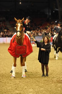Laura Bechtolsheimer (Mistral Hojris), Charlotte Dujardin (Valegro) and Carl Hester (Uthopia) took the top three places in the Reem Acra FEI Grand Prix freestyle at Olympia last night.